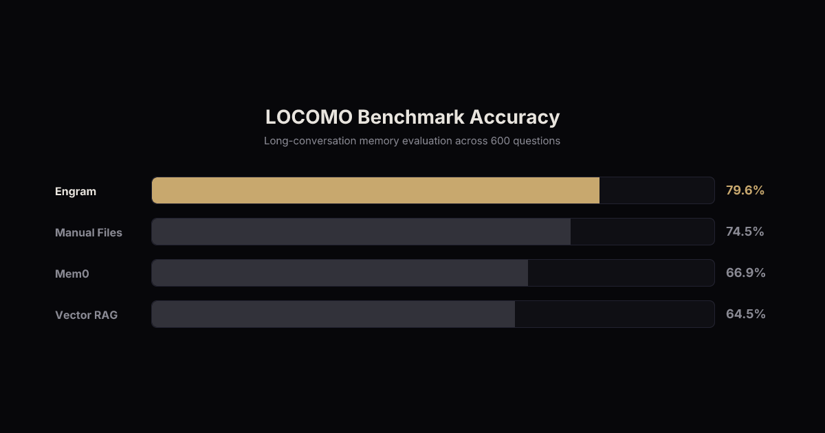 The key insight: vector search alone scores 64.5% on the LOCOMO benchmark. Adding Engram's intelligence layer on top of the same vectors pushes it to 79.6%. That's a 15-point improvement from smarter retrieval, not more data.