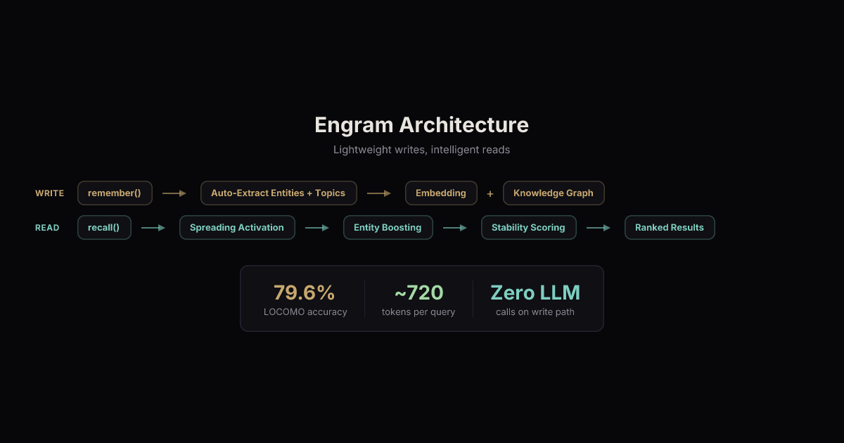 The write path is lightweight. When a memory comes in, Engram auto-extracts entities and topics, generates an embedding, and adds it to the knowledge graph. No LLM call needed.