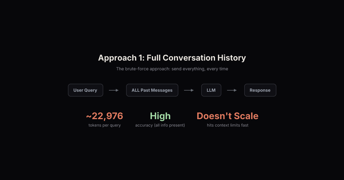 It works surprisingly well for short conversations. Accuracy is near-perfect because the model sees everything. But token costs scale linearly. A 128K-token context at GPT-4 pricing runs about $1.28 per query on input alone. An agent handling 1,000 queries a day would burn $1,280 daily just on memory. And eventually you hit the context window limit and can't fit everything in anyway.