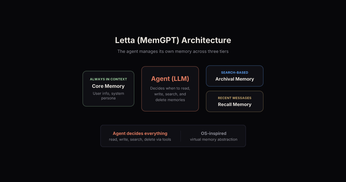 Letta takes a different angle: the agent itself manages its own memory. Inspired by operating system virtual memory, it gives the agent explicit tools to read, write, and search across three memory tiers: core memory (always in context), archival memory (search-based), and recall memory (recent messages).