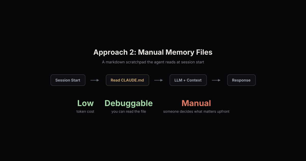 It's token-efficient and easy to debug. You can open the file and see exactly what the agent knows. But it doesn't scale. Someone has to decide what matters before knowing what will be asked. A passing mention of a restaurant might turn out to be critical three months later, and the manual approach will have skipped it.