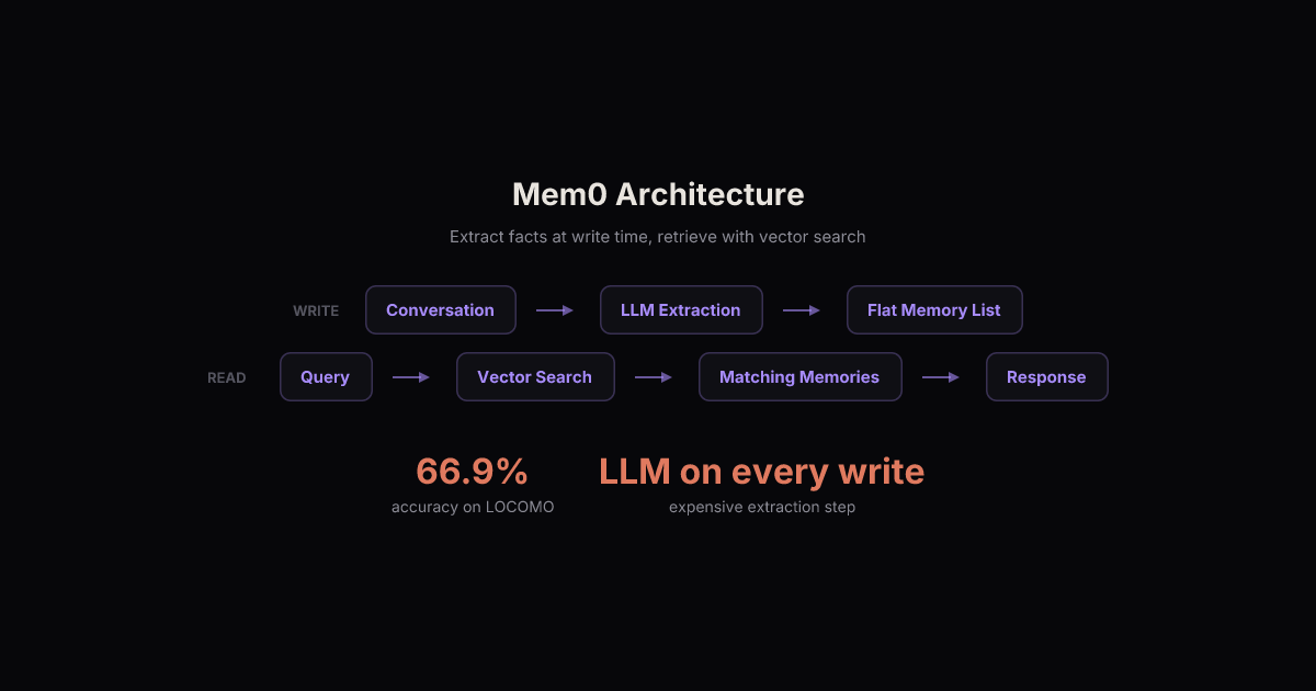 Mem0 is the most popular dedicated memory library, YC-backed with 50K+ in the community. Their approach: extract structured facts from conversations at write time, then retrieve them with vector search. So "Sarah mentioned she started a new job at Google last week" becomes the memory "Sarah works at Google."