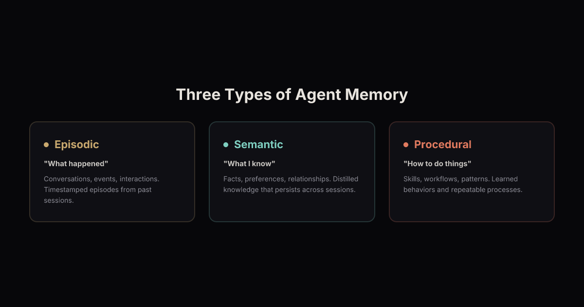 Episodic memory is "what happened." Conversations, events, interactions. The raw record of experience. When you tell your agent you prefer TypeScript over Python, that conversation is an episode.