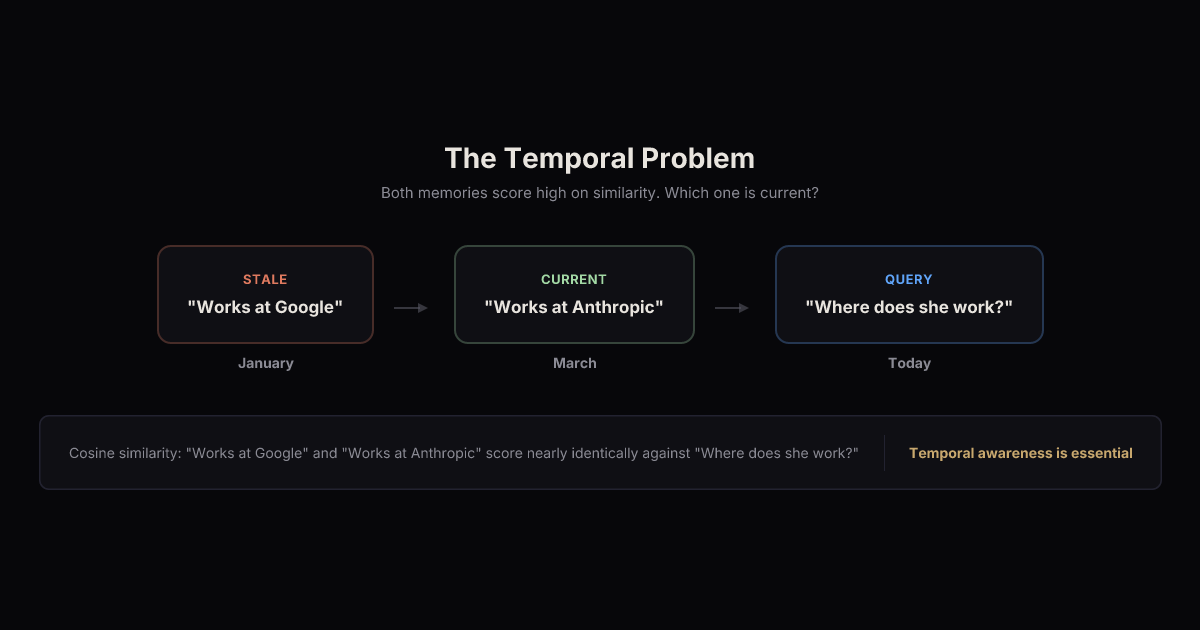 Sarah worked at Google in January. She switched to Anthropic in March. When you ask "where does Sarah work?" today, both memories score high on relevance. Full context injection handles this naturally because the model sees messages in chronological order and picks the latest one. But any system that retrieves by relevance rather than recency has to solve this explicitly.
