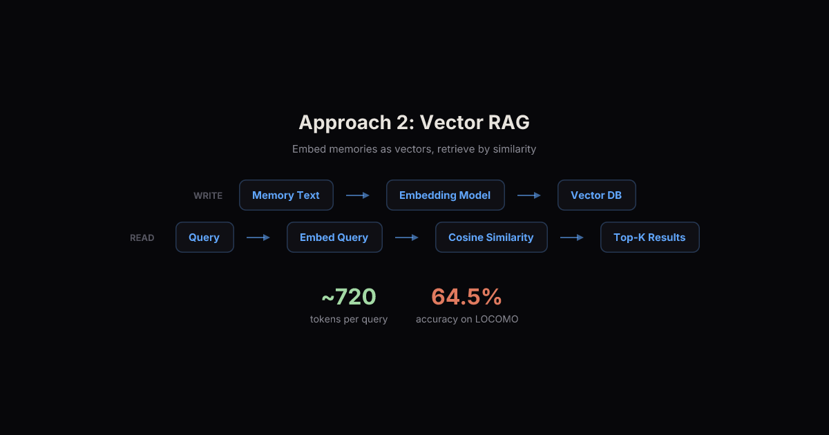 The industry standard first step: embed memories as vectors, retrieve by cosine similarity. This is what most tutorials teach and most prototypes use.