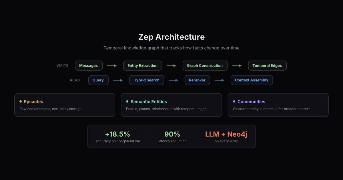 The tradeoff is infrastructure. Zep runs on Neo4j and requires LLM calls on every write for entity extraction and resolution. It's enterprise-grade tooling with enterprise-grade complexity.