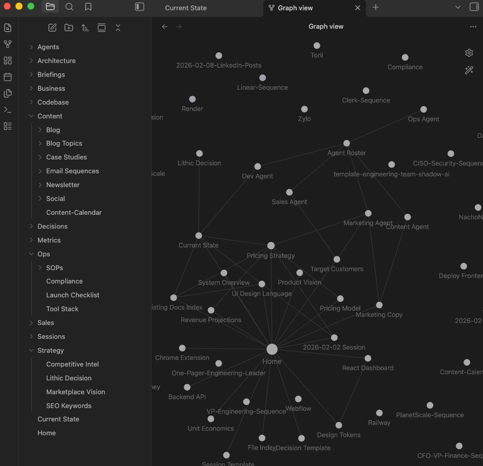 The key insight is that Obsidian files are just markdown. Claude Code can read and write them natively. So the vault becomes a shared workspace between me and the AI. I write strategy docs, the AI reads them when building features. The AI generates a competitive analysis, I review it in Obsidian and refine it. It's a feedback loop that gets better the more you use it.