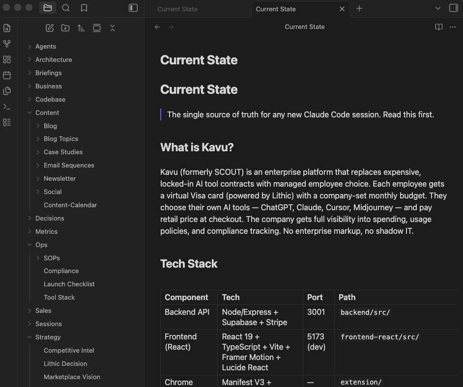I keep a vault for each major project. Inside each vault is a currentstate.md file that serves as the single source of truth. It describes what the project is, what the tech stack looks like, what's been built, what's broken, and what's next. Every time I start a new Claude Code session, the AI reads that file first. It means every session starts with full context instead of me re-explaining the same things.