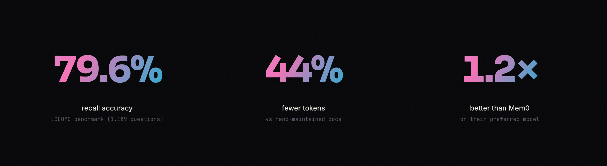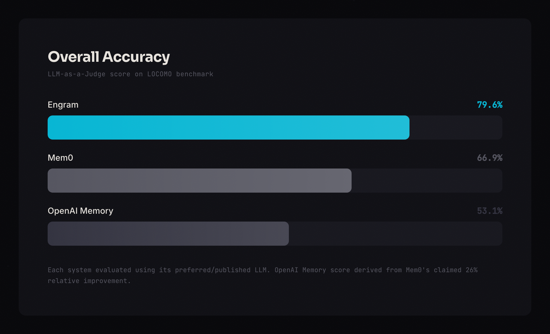 I ran it against LOCOMO, the standard benchmark for agent memory (1,189 questions, the same benchmark Mem0 used to claim state-of-the-art). Engram scored 79.6% recall accuracy, compared to Mem0's published 66.9% and OpenAI Memory's 53.1%. It uses 776 tokens per query, 96.6% fewer than stuffing full conversation history into the prompt. You can see the full research on the site.