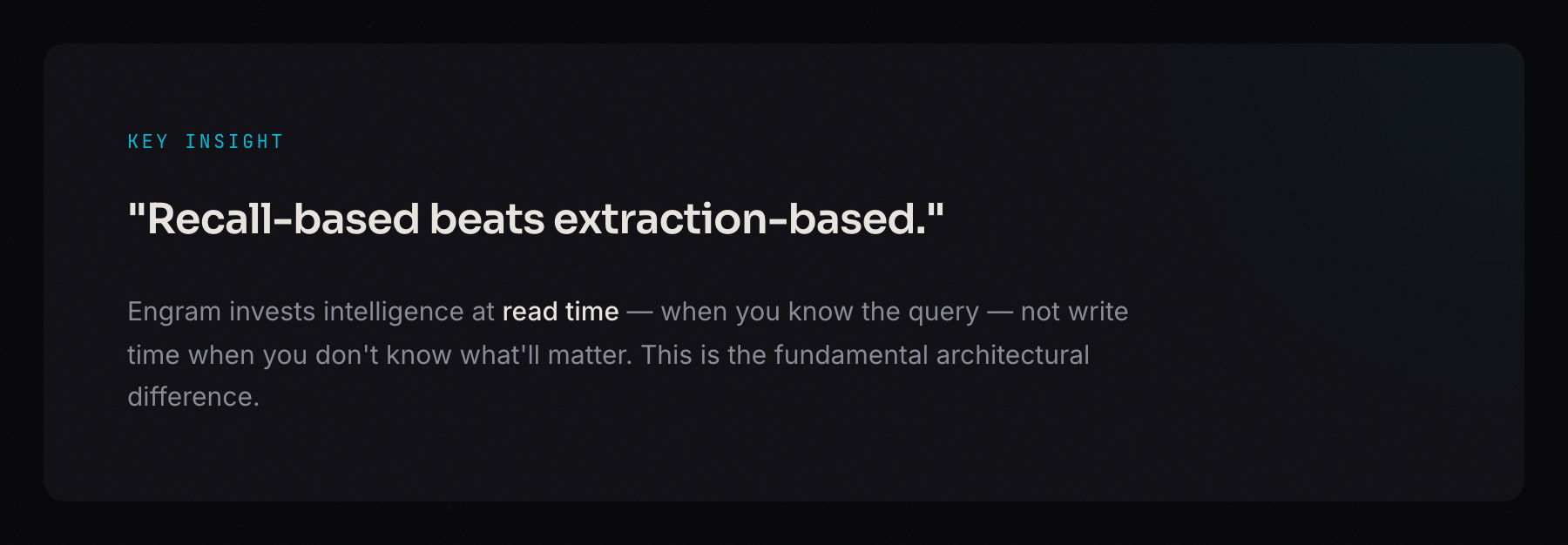 The key architectural decision was investing intelligence at read time instead of write time. Most memory systems try to extract and summarize when you store something, before they know what will matter later. Engram stores raw episodes cheaply and does the hard work at recall, when it actually knows the query.
