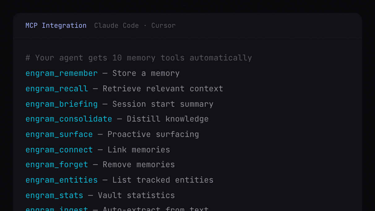 Engram is a memory protocol for AI agents. Not a vector database. Not a RAG pipeline. It's modeled after how human memory actually works, built around three ideas.