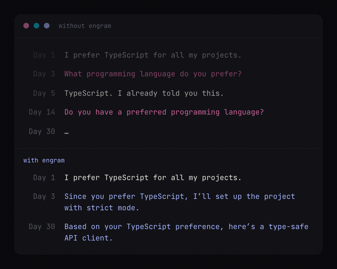I've been using Engram every day for a while now, and it has been blowing my mind. The difference between an agent that remembers you and one that doesn't is hard to overstate. I've heard the same thing from early testers. One of my early users is building a personal portfolio site, and in a totally different session and workspace, he asked his agent to pull in a featured project he'd been working on. Engram surfaced all the relevant details in a second. His agent built out the entire featured project section without any additional context sharing or searching. That's the kind of moment where it clicks. Once you have it, you can't go back to the blank slate.