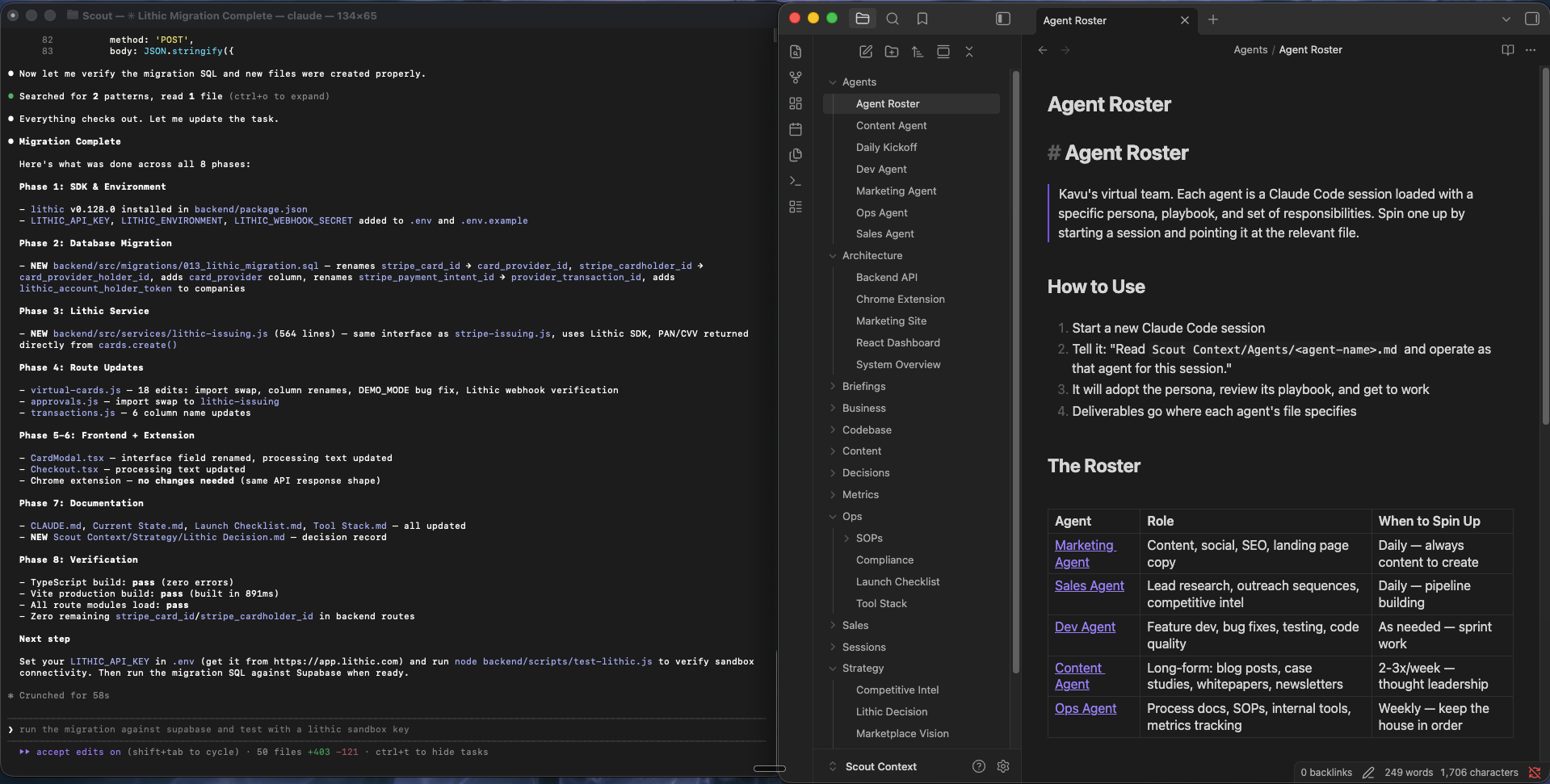 But it goes beyond just remembering where you left off. I use Obsidian to organize everything around a project: competitive research, architecture decisions, content calendars, strategy docs, launch checklists. The folder structure becomes a map of the whole project, not just the code. When I ask the AI to help me plan a feature or write a blog post, it can pull from the same knowledge base I use to make decisions.