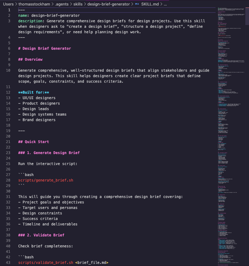 Skills are saved prompts or workflows that you can invoke with a single command. Instead of re-explaining what you want every time, you run /design-brief or /content-writer and the AI already knows the process, the output format, and the quality bar. Think of them like scripts, but for AI behavior instead of code.